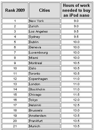 As cidades do mundo mais caras e mais ricas, medida pelo recente índice iPod! É algo similar ao Big Mac Index. O índice iPod mede quanto tempo um trabalhador teria que trabalhar para poder comprar o MP3 player da Apple. Aqui.