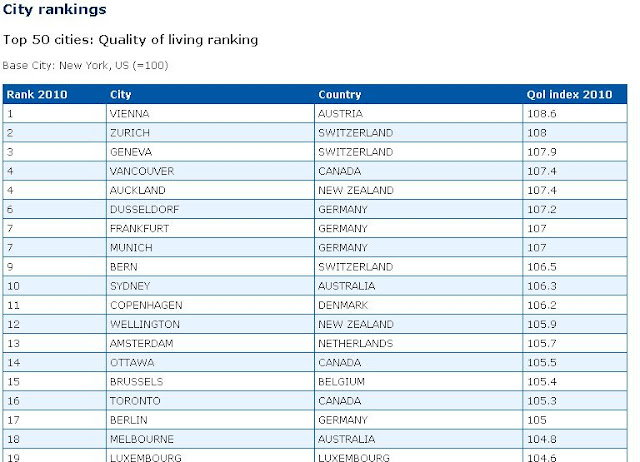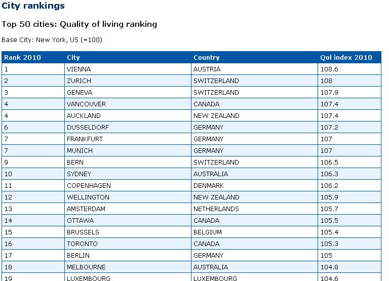 A Mercer, uma empresa global de recursos humanos, consultadoria e outros serviços financeiros, publicou, em 2010, um ranking da qualidade de vida nas cidades do mundo, considerando um total de 221 cidades. As condições de vida são analisadas de acordo com 39 indicadores, agrupados em 10 categorias: