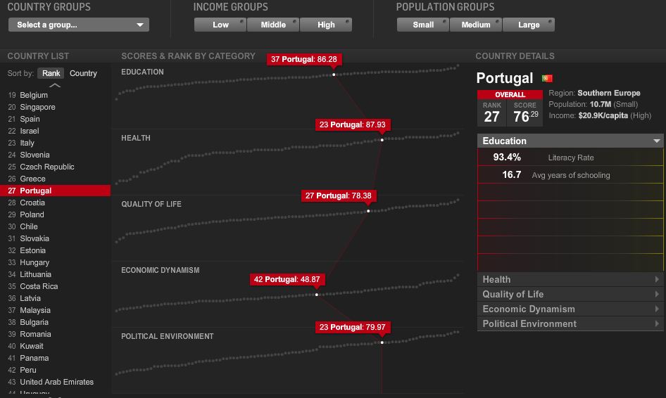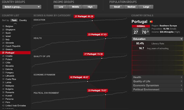 A revista norte-americana Newsweek estabeleceu um ranking dos 100 "melhores" países do mundo para se viver. Para isso, seleccionou 5 dimensões (educação, saúde, dinamismo económico, ambiente político e qualidade de vida) e vários indicadores para cada uma delas. Este estudo determinou que a Finlândia é o primeiro país do ranking e que Portugal ocupa a 27ª posição como postei aqui a propósito de uma notícia do DN sobre este assunto. Deixo aqui o link para uma infografia interactiva que nos mostra os detalhes deste estudo.