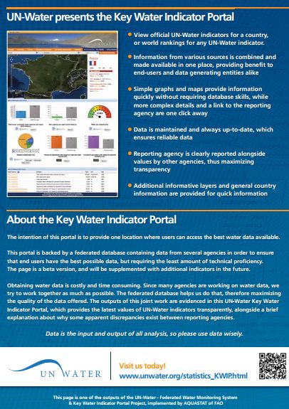 UN-Water has created a portal to view maps, tables, and charts on indicators, at either country or global level, as well as additional geographic information. This portal is easy to operate and puts additional details one click away.