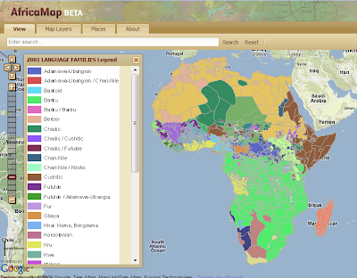 O site AfricaMap da Harvard University, oferece dezenas de conjuntos de dados raster e vectorial que podem ser exibidos dentro de uma interface do Google Maps existente no próprio site. Os dados abrangem diferentes categorias: geografia, política, economia, ambiente, linguística, étnica, história e muito mais. A maioria dos conjuntos de dados também pode ser transferida para o nosso computador em formato GIS – compatível (shapefile, por exemplo); também disponível no formato do Google Earth KMZ (indicado por um "3D" na lista de dados). Aqui está um mapa das famílias de línguas africanas, 2001: