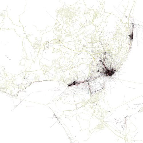 Eric Fischer representou graficamente no OpenStreetMap a densidade de fotografias geoposicionadas numa série de cidades (cerca de 50) em todo o mundo. Para este fim, Eric Fisher partiu das fotografias que contêm informações sobre a sua posição geográfica alojadas no Flickr e Picasa. Aqui. O exemplo é o da cidade de Lisboa.