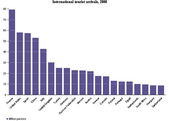 Assim como tem sido nos últimos 15 anos, a França continua a ser destino preferido no mundo, atraindo um pouco menos de 80 milhões de visitantes em 2008 (o ano mais recente para o qual existem dados completos disponíveis). Os Estados Unidos estão em segundo lugar, com cerca de 58 milhões de visitantes, enquanto a Espanha está em terceiro, com pouco mais de 57 milhões. Portugal aparece em 15º lugar com 12,3 milhões de turistas no ano de 2008.