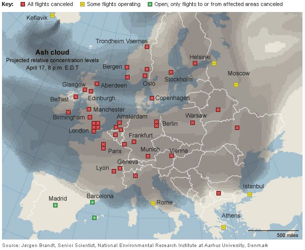 Como se fosse um computador bloqueado, o vídeo a seguir mostra o processo de "reiniciação" do espaço aéreo europeu depois da crise do vulcão islandês. Em particular, podemos ver os trajectos dos voos entre os dias 18 e 20 de Abril de 2010. Os dados são do flightradar24.com sobre os mapas do openstreetmap.org. Nem todo o espaço aéreo é analisado. Por exemplo, não está incluído grande parte do território da França nem voos transatlânticos.