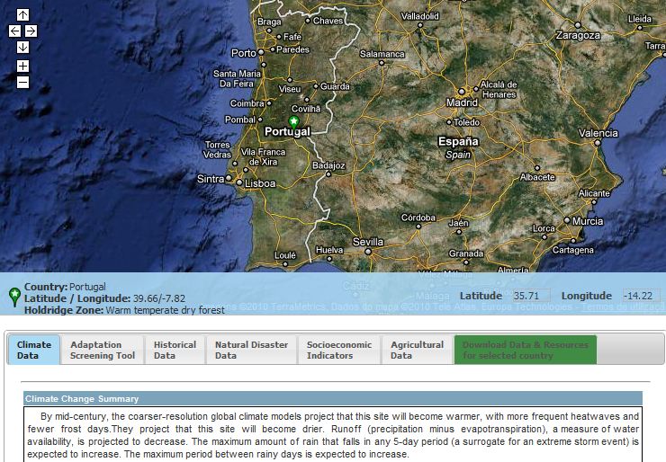 A partir da página inicial deste Portal temos acesso a projectos e documentos do Banco Mundial, assim como a uma base de dados de conhecimento sobre as adaptações às mudanças climáticas e a bases de dados e ferramentas externas sobre o clima e as alterações climáticas.
