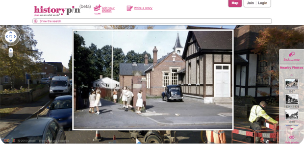 O movimento Are What We Do, em parceria com o Google lançaram o Historypin. Este projecto centra-se, pelo menos por agora, na Grã-Bretanha, e é um exemplo curioso de como usar o Google Street View para mostrar o passado . Através de um gráfico de escala temporal, os utilizadores podem colaborar e / ou desfrutar de um passeio através do tempo sob a forma de velhas fotografias, convenientemente geolocalizadas, datadas e anotadas. Como uma experiência para o ensino de história é, certamente, muito atraente.