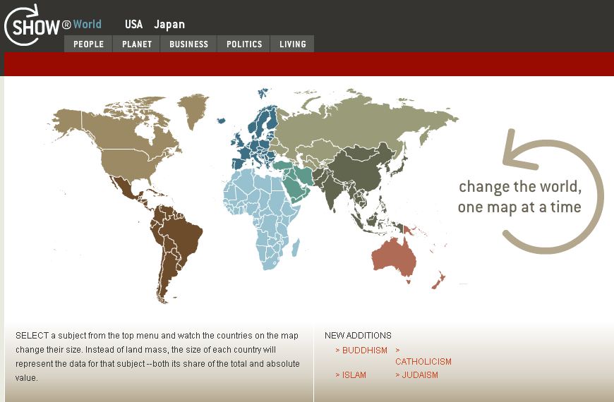 Escolha um indicador e verifique as anamorfoses (alteração das dimensões) dos países em função do valor que registam nesse indicador. Possibilidade de fazer o download em formato imagem, dos dados (de fonte credível) em Excel, ou o código para incorporar num site ou blogue. Aqui