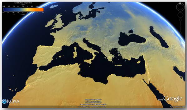 O utilizador Gerardo64 criou na Google Earth BBS um ficheiro que contem camadas de informação resultantes de conjuntos de dados globais disponibilizados pelo NOAA Environmental Visualization Laboratory. Os dados utilizados para criar os mapas foram recolhidos por satélites e são actualizados todos os dias. As camadas disponíveis vão desde a temperatura da superfície terrestre à concentração de ozono ou ao risco de seca. Aqui.