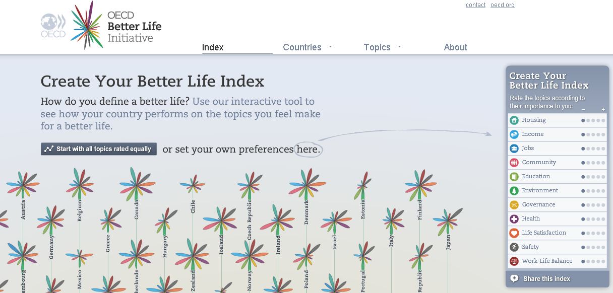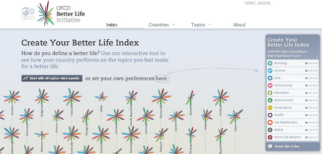 Nos últimos 70 anos, os economistas têm estado focados na medição do output económico. O indicador escolhido para esta medição, o produto interno bruto, tem limitações, porque não leva em linha de conta o esgotamento dos recursos naturais e exclui os serviços não pagos, como o voluntariado. No dia 24 de Maio, a OCDE lançou um processo alternativo de medir o bem-estar, o Better Life Index, que inclui 20 indicadores em 11 diferentes sectores (Housing; Income; Jobs; Community; Education; Environment; Governance; Health; Life Satisfaction; Safety; Work-Life Balance) que a OCDE considerou essenciais. Este índice cobre, neste momento, os 34 países membros. Foi produzida uma ferramenta interactiva que permite aos utilizadores alterar o peso de cada sector de acordo com a visão que cada uma de nós tem da sua importância. Assim, podemos personalizar o índice e com ele comparar os países pertencentes à organização... e compartilhar esse índice com colegas e amigos. Os resultados são apresentados numa forma gráfica em flor. São disponibilizados, ainda, vários relatórios por país membro. É a OECD Better Life Iniciative que comemora o cinquentenário da organização. Aqui.